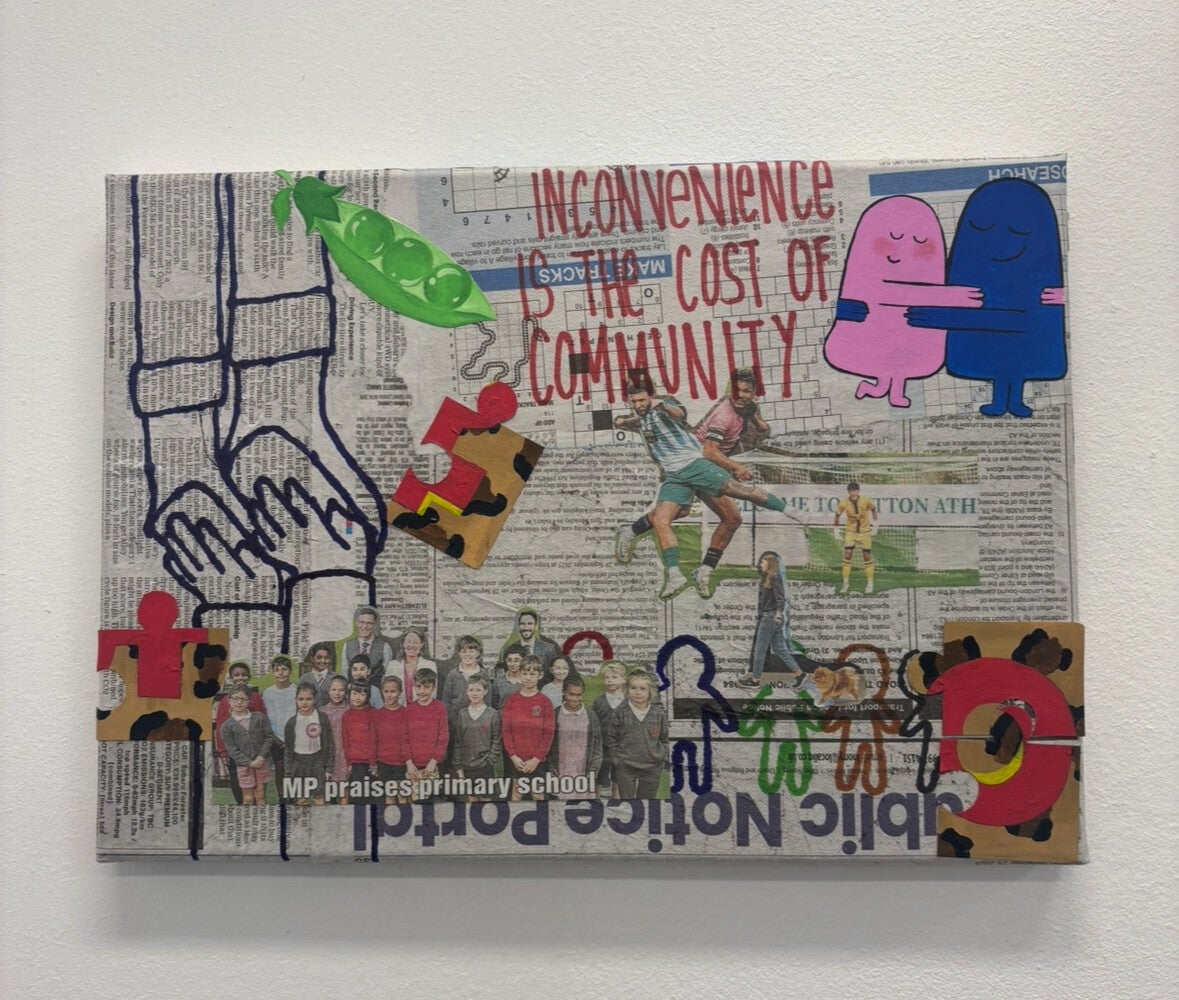 untitled (public service portal), 2025, newspaper on canvas, marker, acrylic on paper glued on canvas