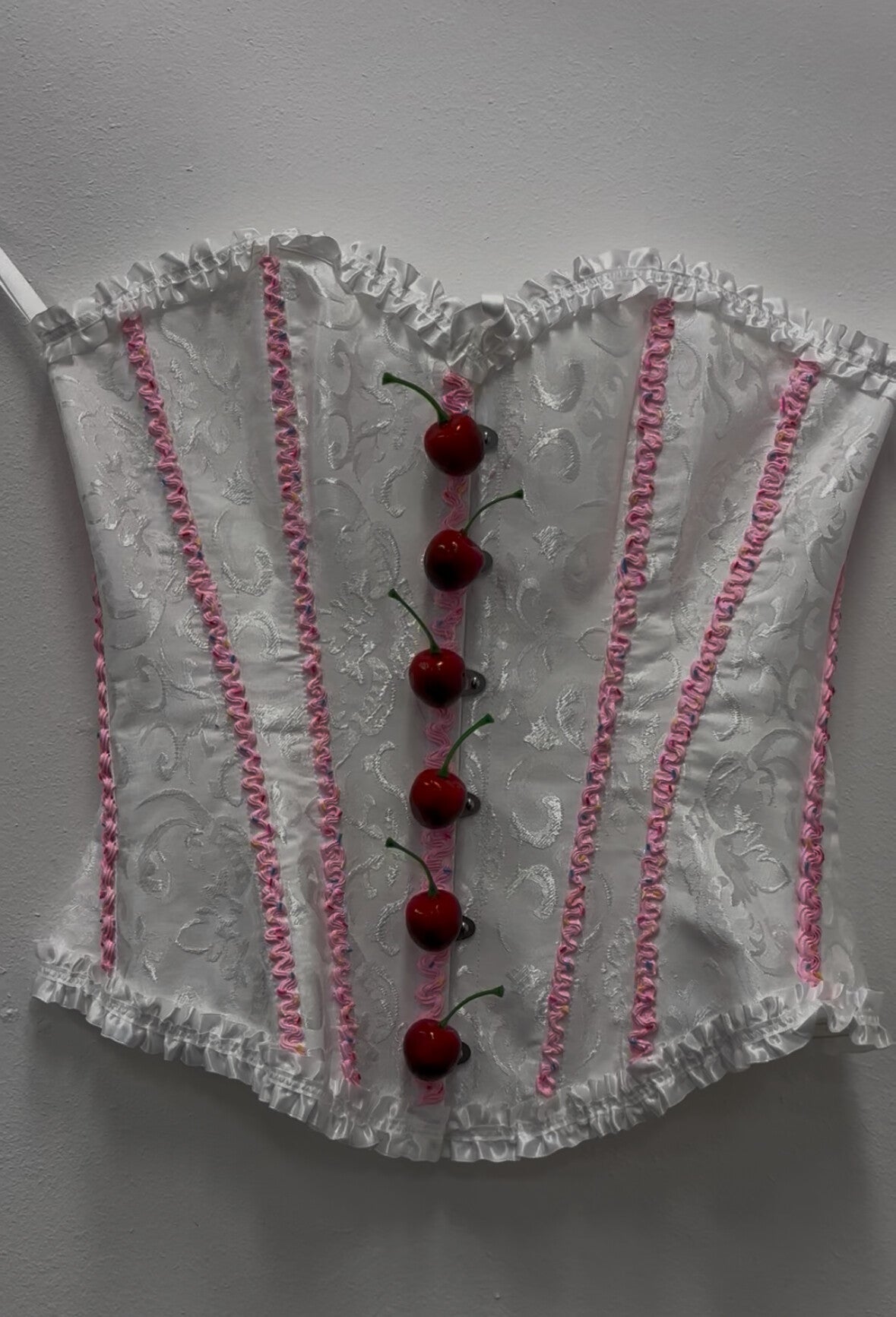 cherry on top/ having my cake & eating yours too, 2025, corset garment and acrylic painted high heels decorated with cake glue, artificial sprinkles and cherries, artificial nails made with different kinds of nail gel, photography